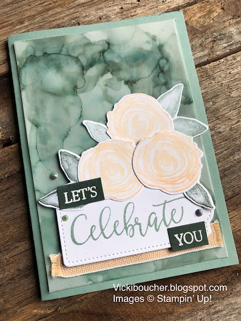 The sentiment is from the Create with Friends Stamp Set I've fussy cut out the stamped image 'Celebrate' and heat embossed the 'Let's & You' using Versamark Ink, White Stampin' Emboss Powder and Heat Tool. To finish off I added a few of the Clear Epoxy Essentials to the card.